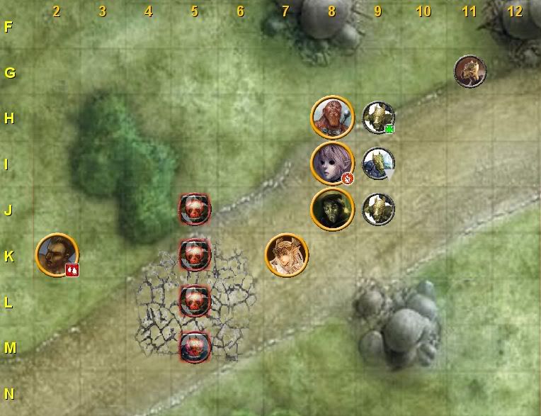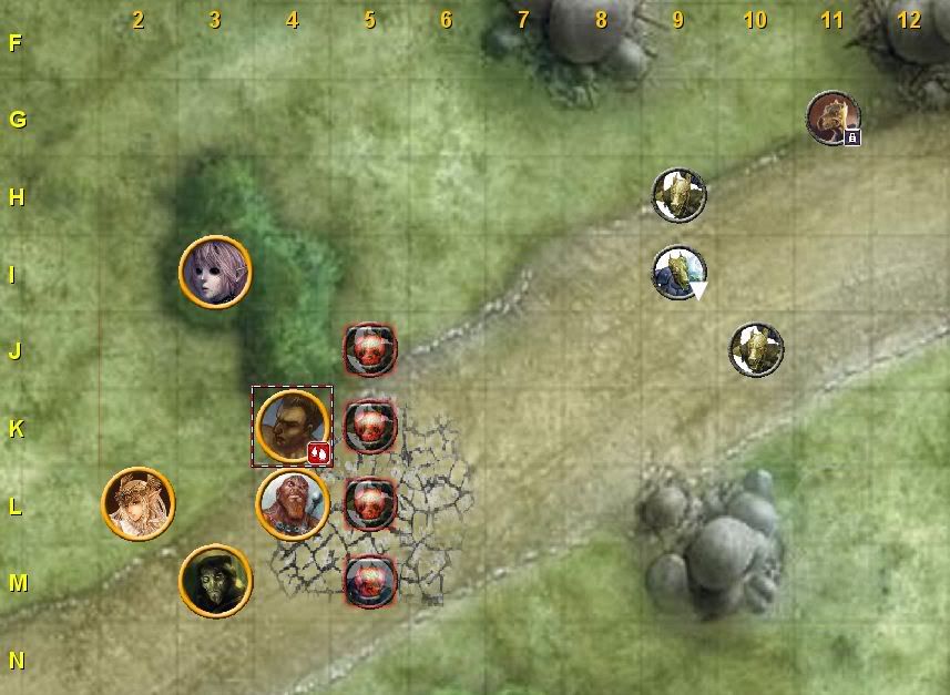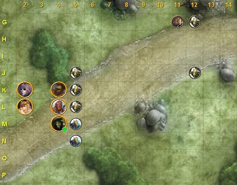As they approach a group of large boulders, the group is startled by the war cries of a group of small reptilian humanoids. Five of them rush out onto the road, clearly looking for a fight. They catch the adventurers completely off guard, and three of them rush the group. The other two hurl javelins from where they stand. Truckbus laughs as the attacks bounce off his armor, and Daituk easily dodges his attacker, but Zeno isn't so fortunate. Dragonshields and Slinger delay until after minions. Zeno takes 8 damage, 4 from both attacks against him. All other minions miss. Another creature appears from behind a rock on the left side of the road - he moves out of his hiding place and launches an odd sphere toward Daituk with his sling. The sphere misses by an inch, and bursts into flames when it lands a few feet away. At the same time, two more of the creatures slide out from behind a rock on the other side of the road and rush Daituk, hoping to catch him off guard. He manages to block the first attack, but the second finds its mark. Daituk takes 9 damage from the Kobold. Marked by the north dragonshield until the end of its next turn. :savepoint:Thia 9, Daituk 9, Zeno 5, Truckbus 3, Luciel 2, Kobold Minions 10, Kobold Slinger 9, Kobold Dragonshields 9 Bushes are difficult terrain and provide cover against ranged attacks. Boulders also provide cover. oops, forgot defenses Minions - AC 15; Fortitude 11, Reflex 13, Will 11 Slinger - AC 13; Fortitude 12, Reflex 14, Will 12 Dragonshields - AC 18; Fortitude 14, Reflex 13, Will 13 |